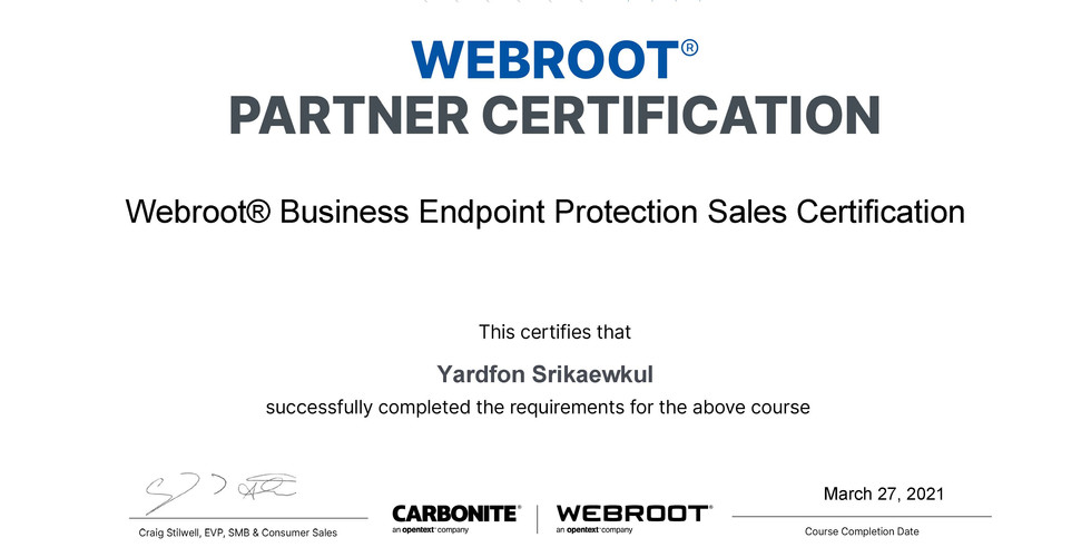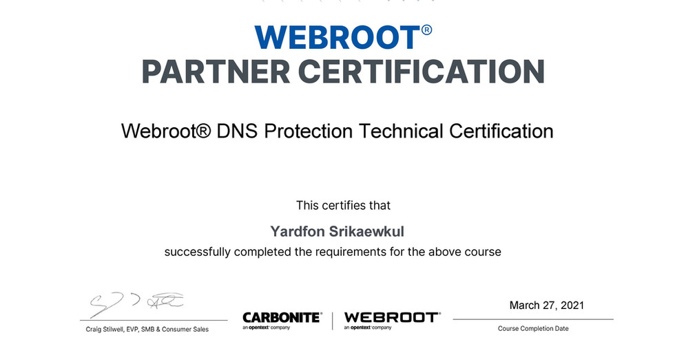 Congrats to "Yardfon Srikaewkul'' Bangkok System Group team, She successfully completed the requirement for - Webroot® Business Endpoint Protection Sales Certification - Webroot® Business Endpoint Protection Technical Certification - Webroot® DNS Protection Technical Certification